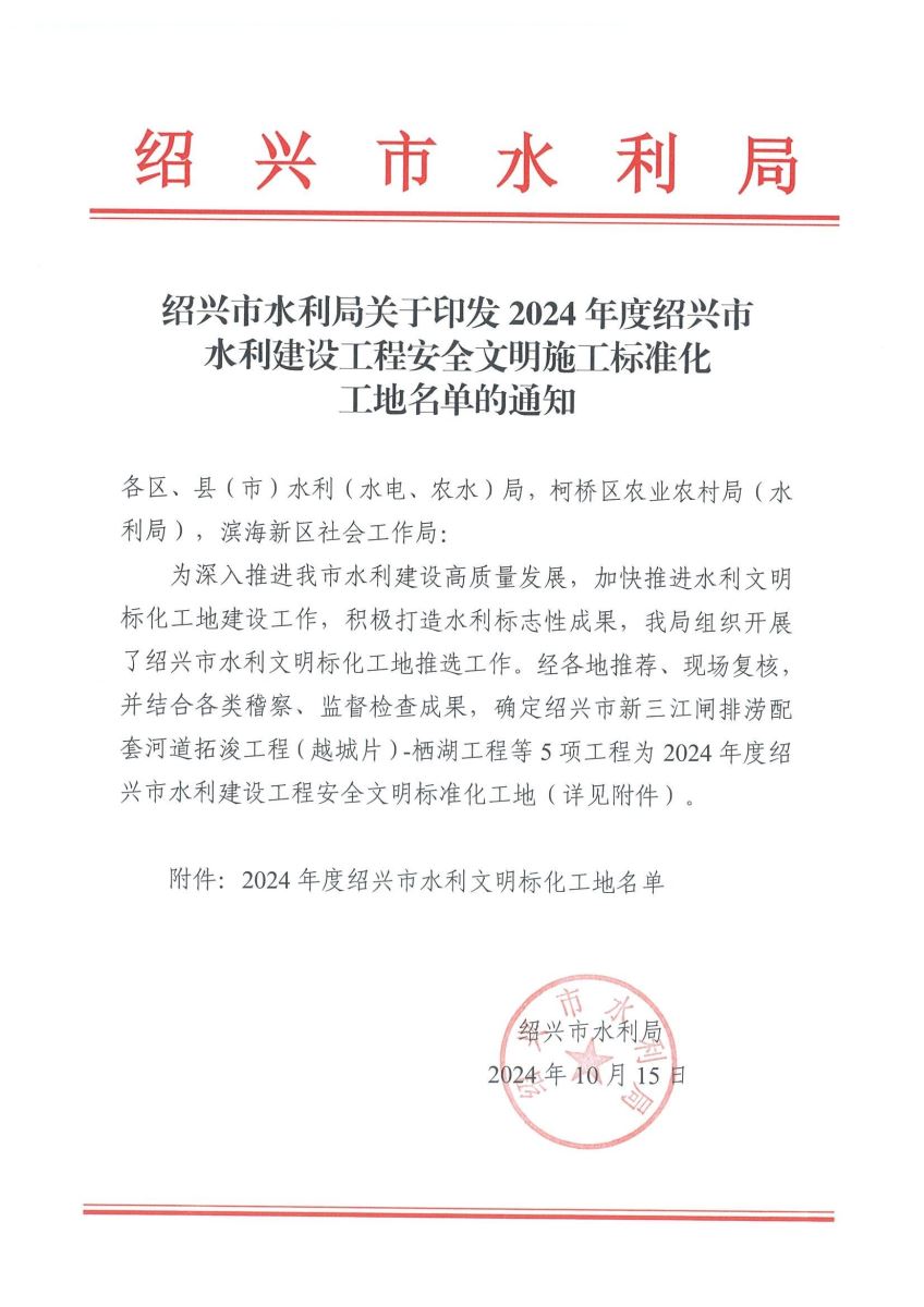 近日,公司所承建的“紹興市上虞區虞北平原崧北河綜合治理工程施工3標”及“金東區金義快速路市政化改造及路域環境綜合提升工程EPC項目”,項目部通過在施工中各項安全文明標準化措施的管控下,分別榮獲“2024年度紹興市水利建設工程安全文明施工標準化工地”和“2024年度金華市園林綠化工程施工安全生產標準化管理優良工地”稱號。